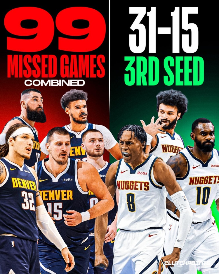 欧冠数据统计分析-4主力+瓦兰合计缺席99场!掘金依旧31胜15负排西部第三!